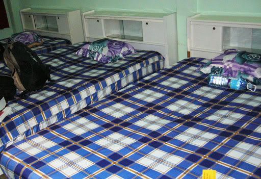从 Bui Vien走5分钟就到了 De Tham Street,第一件事就是去 Sinh Café 买明天去梅内的车票 (60,000D),顺便也在这里兑换越币。据说便宜的住宿都聚集在 Pham Ngu Lao, De Tham Street 一带, 这一条街两旁都是廉价旅馆,我们五人分头行事,一间一间进去问价钱。可惜,便宜的房间全都满了,有些旅馆还狮子开大口。后来,一位越南女人走来问我们要不要房间,可以给我们便宜的价钱。其实我们不是很想,可是De Tham有空房的住宿都很贵了,没办法只好跟着那女人去看房间。怎知,那不是什么旅馆,而是在De Tham 里一条小巷里的当地人的住家。进到那很不友善屋主的家,二楼和三楼各有一间房出租,房间很大也算干净,可是根本没有其他租客,很明显是非法的住宿,感觉好像黑店~! 我们讨论了很久,就连那女人(只是介绍人)也生气走人了,最后为了省钱还是决定住这里。两间房,一晚的住宿是USD17,一人大概3美金。