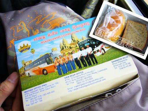 这一天没什么特别的行程,就只是赶路。之前托 Mandalay Inn 帮我们买了暹粒往胡志明 (Mekong Express) 的巴士票,单人票价USD20, 而且还有Shuttle Bus来Mandalay Inn载我们到巴士站。早上6点,Shuttle Bus就到了,工作人员都帮我们搬行李上巴士,还把我们的背包贴上了Tag, check-in背包。由于我们是第一批乘客,所以小巴还得到其他酒店载人。在车上的我,看着暹粒,感觉有点不舍得离开似的。7 点钟左右,我们就来到了暹粒巴士站,很多当地妇女一看到游客,就冲上前兜售各种各样看来好奇怪的食物。巴士开动了,Mekong Express 的巴士服务还真不错,不但有巴士小姐在前面一直用英语和柬语讲解巴士路线和柬埔寨的历史,而且巴士小姐细心的为乘客派食物盒,水和湿毛巾。