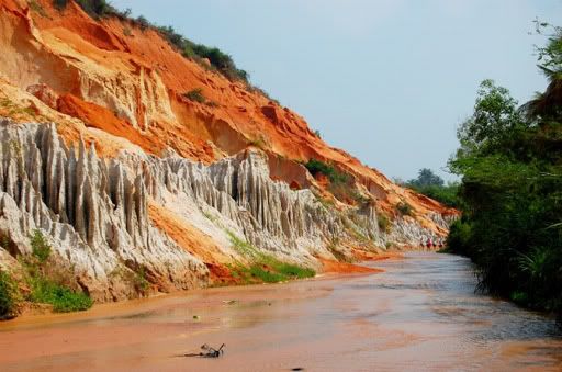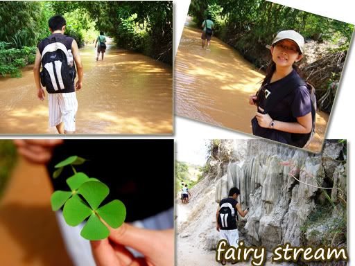 拍得过瘾后,我们继续我们的最后一站,Fairy Stream。这里,我该怎么说呢?其实,来到这里,我们必须赤脚在水上走一段路,一路上看那多年来被风化后而形成的山,沙和土。这里的沙比白沙丘还细,山腰有着白,黄,褐三种颜色的土, 可以说是蛮特别的。据说走到尾段还可以看到瀑布,可是那时太阳实在太猛烈了,我们还没走到瀑布就放弃了。