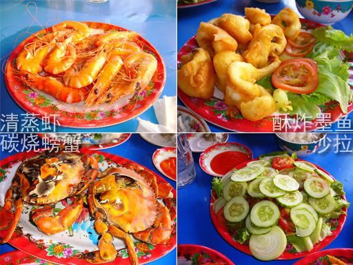 下午4点半,其实我们也饿了。随着Lonely Planet介绍的海鲜餐馆去吃海鲜。我忘了那餐馆的名字,只记得是在梅内街南部路边,靠近海边的一间餐馆,蛮大间的。不知是否还早,根本没有其他客人。进去时,员工们都在睡午觉。既来之,则安之。我们就开始选海鲜,然后吩咐他们煮。这里的海鲜都以重量计算, 然后煮法都是以清蒸,烧烤为主简单的烹调方式。我们选了虾,螃蟹和墨鱼,另加了个蔬菜沙拉搭配。其实,那时我不是很舒服,所以感觉食物没什么味道,只吃了一点,所以不宜置评食物的好吃指数。但他们都说满好吃的,虾很新鲜,螃蟹的蛋黄很多。