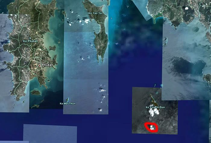 Maya Bay在皮皮岛下面,东经98º 45' 55.34,北纬7º 40' 32.19(红圈的地方)