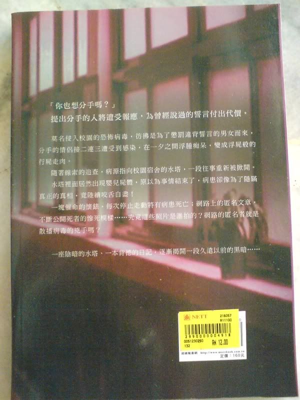 校园灵异故事。   校园掀起一阵恐怖疑云。不知感染途径、症状无法治愈,莫名蔓延开的病症正四处扩散!   病患似乎想吐出真相,却一个接一个诡异地咬舌自尽,究竟这座校园里隐藏著什麽样不为人知的秘密……   「你也想分手吗?」 提出分手的人将遭受报应,为曾经说过的誓言付出代价。   莫名侵入校园的恐怖病毒,彷佛是为了惩罚违背誓言的男女而来,分手的情侣接二连三遭受到感染,在一夕之间浮肿痴呆,变成浮尸般的行尸走肉。   随著线索的追查,病源指向校园宿舍的水塔,一段往事重新被掀开。   水塔里面居然出现婴儿尸体,原以为事情结束了,病患却像为了隐瞒真正的真相,竟陆续咬舌自尽!   一块催命的怀表,每次停止走动将有病患死亡;网路上的匿名文章,不断公开死者的惨死模样……究竟这些照片是谁拍的?网路的匿名者就是散播病毒的凶手吗?   一座阴暗的水塔、一本背德的日记,逐渐揭开一段久远以前的黑暗……