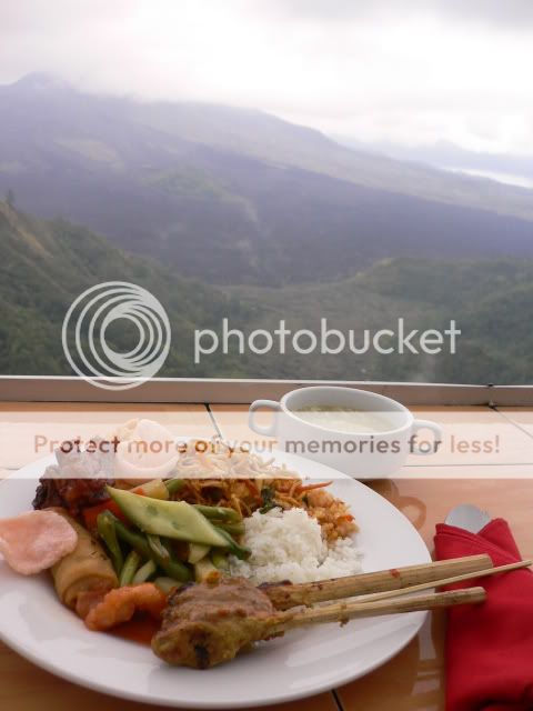 坐在火山口享用午餐,看着浩瀚的山脉及美丽的Batur Lake 真是人生绝好的享受!只可惜天不作美,下起微微细雨来。不过,当我们搬到小亭子享用那不甚好吃的自助餐时感觉还是很好呢!眼前的优美景色已摄入我眼帘,打算把清新的温暖空气及眼前的美丽景色一起带返马来西亚。