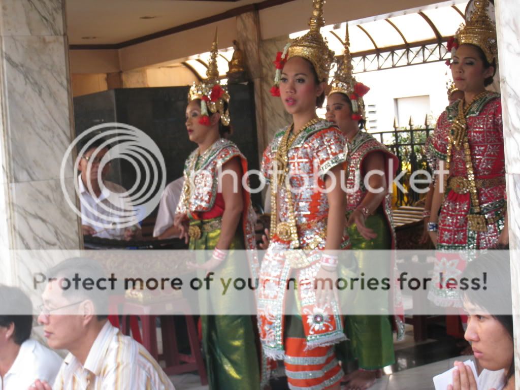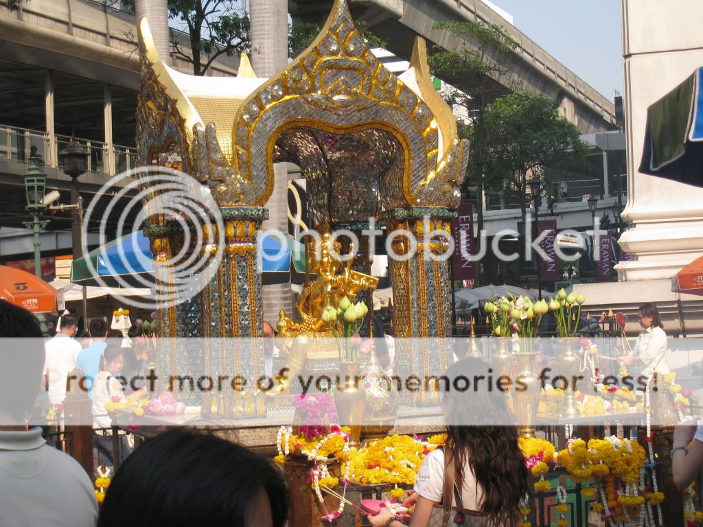 我们去看了闻名的四面佛(ERAWAN SHRINE), 下了站后没多久就看到了,很明显的,好多好多人在拜拜。。 听说这里很灵,可是不要随便答应任何东西,要是愿望实现了却忘了你曾经答应的东西就不好了。。