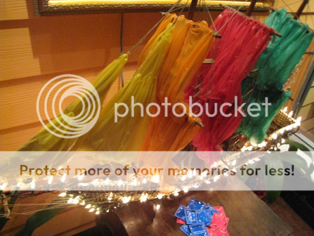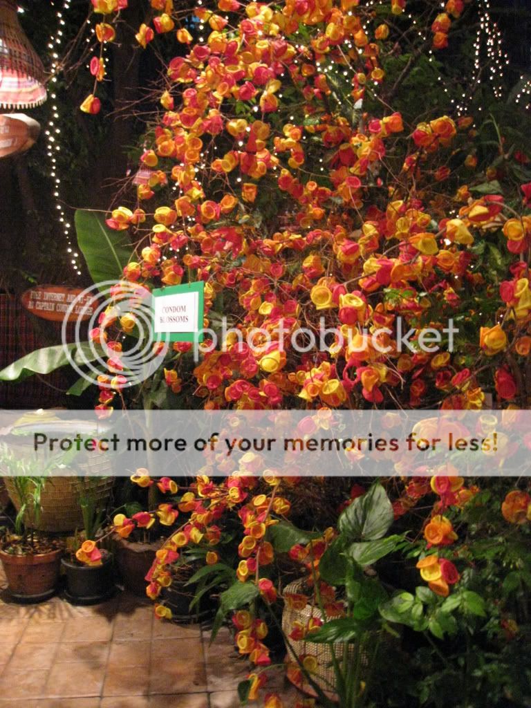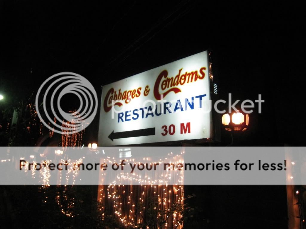 我啊早已想好了晚餐要去哪儿吃了。。嘻嘻。。这也是我从网上找回来的。。 这间餐厅是CABBAGES & CONDOMS. 顾名思义就是这家餐厅的特色就是使用避孕套来布置。。。是在 sukhumvit soi 12, soi 的意思是road/路。。 只要乘坐BTS 到 nana station 就可以了,因为nana bts station 就在 soi 11.. 注意咯,soi 9, 11, 13, 15 实在同一排的,所以 soi 8, 10, 12, 14 就在对面马路,很容易找到的。。