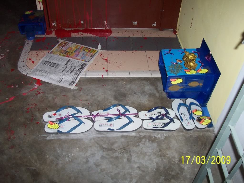 近年来, 恶邻居将鞋子用铁钉和万能胶贴在地上、贴大字报诅咒家人,让人看了很不舒服、也将诅咒字眼写在字条,然后贴在门前的『摆设』上、经常乘我朋友家全部外出后,手持香,在朋友家门前,口中念念有词:@