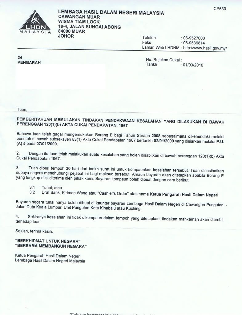 你因该先了解你是否有提交Form E, IRB 会乱来的, 2008 年的form E 因该在2009年 3月 31号前提交。。。如果真的没有提交那么就,填写表格和compound form 然后给罚款,通常是RM200 (不用那么担心) |