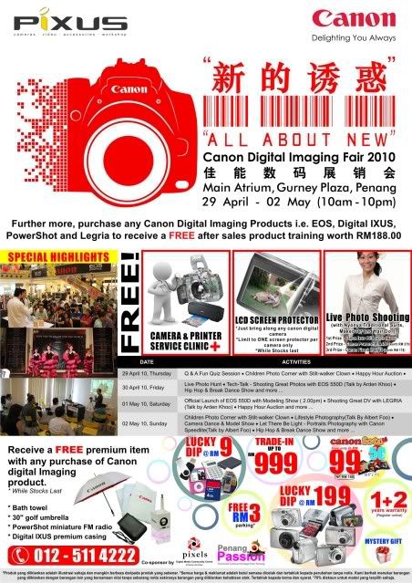 Sunday 2 May 2010 10.00am - Event Begin 12.00pm - Children Photo Corner with Stilt-Walker Clown 1.00pm - Q&A Fun Qiuz Session 2.00pm - Lifestyle Photography (Free Admission) 3.00pm - Camera Dance & Model Show 3.30pm - Happy Hour Auction 4.00pm - Let Ther Be Light - Portraits Photography with Canon Speedlite (Free Admission) 7.00pm - Prize Presentation for Photo Shooting Contest 8.00pm - Hip-Hop & Break Dance Show 9.00pm - Happy Hour Auction 10.00pm - Close