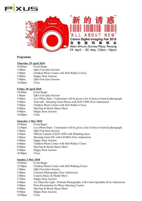 Friday 30 April 2010 10.00am - Event Begin 1.00pm - Q&A Fun Qiuz Session 3.00pm - Live Photo Hunt - Contestant will be given a list of item to hunt & photograph 5.00pm - Tech-Talk - Shooting Great Photo With EOS 550D (Free Admission) 7.00pm - Children Photo Corner with Stilt-Walker Clown 8.00pm - Hip-Hop & Break Dance Show 9.00pm - Happy Hour Auction 10.00pm - Close
