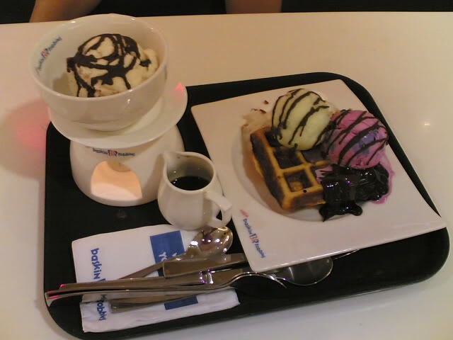 小姐姐cabonara pasta, salad, harsh brown,egg salad,mango jelly. 没有拍到相片haiz!! 然后,我去附近的J co 买 chocoforest>>>> 免费送一个dognut。 再后来,上楼吃日本的草莓ice cream 和manggo ice cream。 开始选草莓和manggo先,然后,放进机器压的。haiz!!没有拍到相片.. 最后去baskin robbin吃waffer ice cream 和afforgato有咖啡的 。