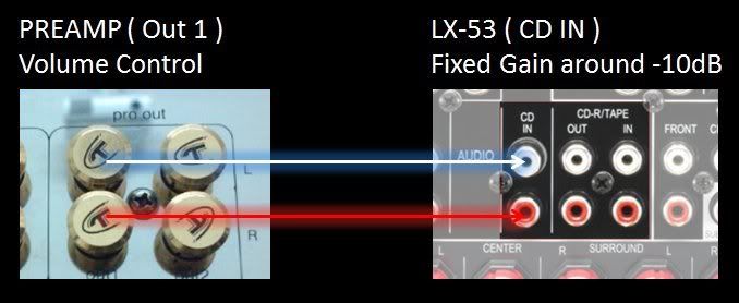 你的这架 Sound Stage 的两个 Pre-out 是给你另接其他的 Power Amp 或 Bi-Amp,不是 AV Amp,除非你的 AV Amp 是可以 Switch 去 Direct Input 当作 Power Amp 使用,那麽就可以 CD 机接去 Sound Stage,DVD 机接去 AV Amp,还要共用一对喇叭,这样子的接法或许可以有声音出,但是效果是会打折扣的。
