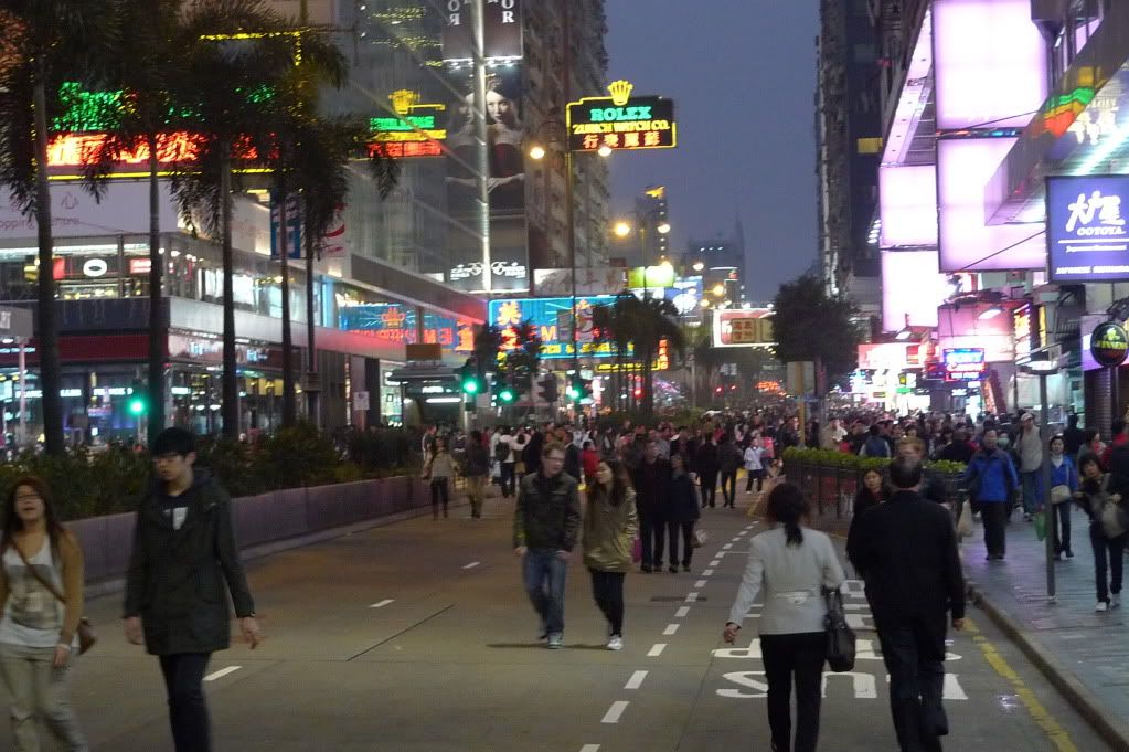 走在尖沙咀的路上,由于警察已经提早封路,可以看到很多人涌到街上。
