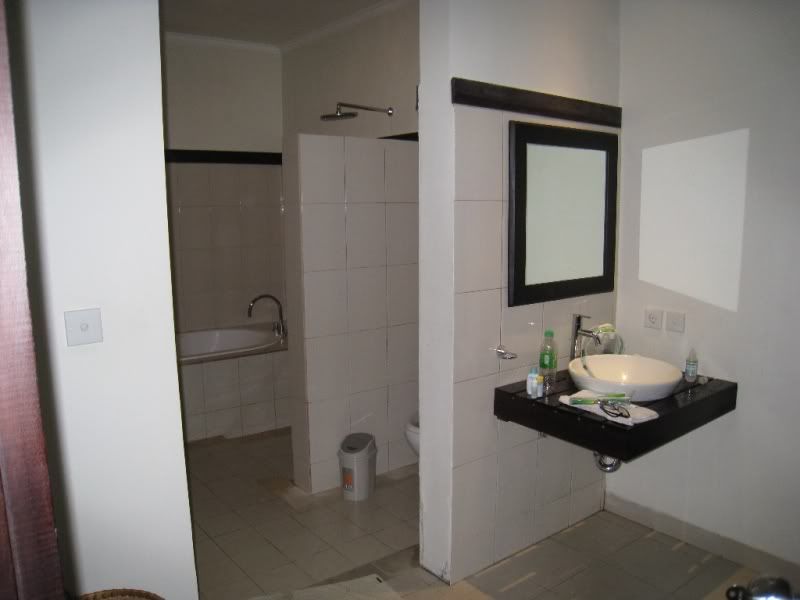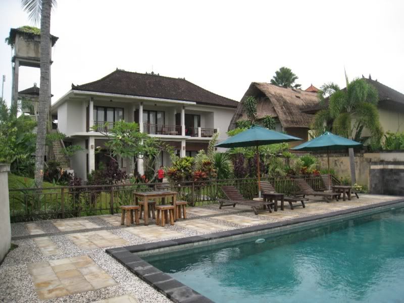 第二早,我们就叫司机带我们去看其他的酒店。问了kebun indah,也去了greenfield tegal sari, 就是没有房了或不够房间给我们9个人。后来司机帮我们打电话去另一间靠近Bebek Bengil的酒店,意外的有3间房。于是我们要求去看房间。房间很新,也干净,厕所很大,价钱也ok。泳池旁边就是一大片稻田。