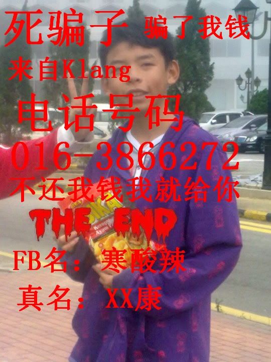 由于他骗我的数目不小 ,所以我希望大家可以揭发他的罪行 叫Klang的人留意这个人,打击网络犯罪,这样他才不会胆大包天在去骗其他人 希望不会再有受害者给这个骗子骗 |