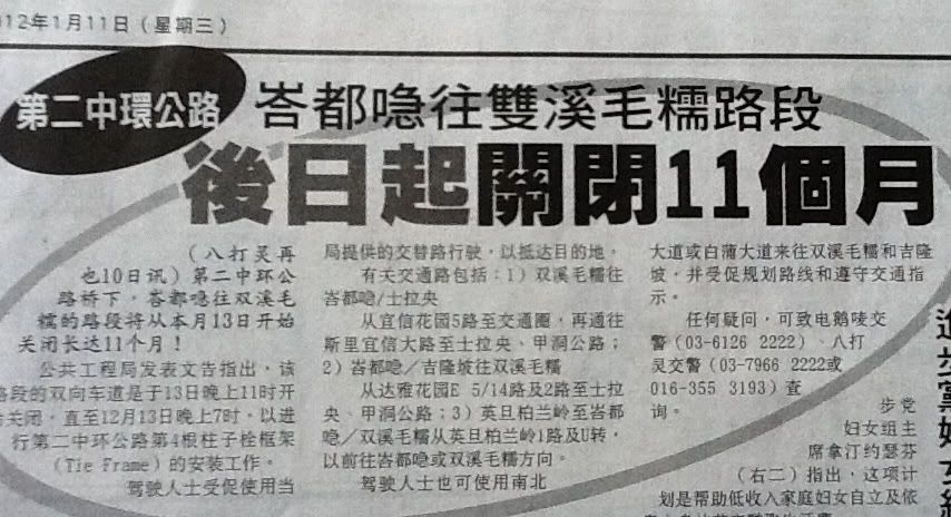 今天看星洲-大都会版,从1月13日晚上11时起,黑风洞与Sg Buloh中间的中环公的又要关闭了,还是一关11个月。