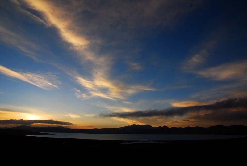 下午七点抵达普尔错,此湖冰面怪异非常,岸边的冰卷扬上翘,湖岸裂开,推测是大风推冰拱岸所至。冰体夹杂的黄色,应是碱渍。湖对面有很多野牦牛,及两头闪烁不定的棕熊。湖东面是一座深入湖心的半岛,我与之犄角之势扎营。晚上砸开岸边的冰取水,碱味很大,只采了冰回去。第一次煮麦片,第一次带麦片旅行,只因在阿里装包时发现还有一点空间,就买了包两斤的麦片。很不好吃,还是碱水味太重?反正是倒掉一半,其实还是负重的阴影,能轻点就轻点。