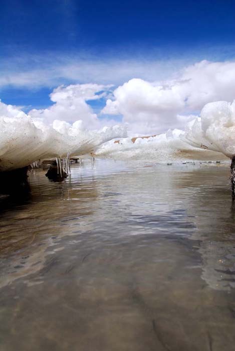 傍晚来到邦达错附近的一处泉眼,泉水流进冰封湖区,冰面上黄斑遍布,是风携来的黄沙与尘土。近湖冰面有很多裂口,我推测下面有泉眼,而非冰层融化所至。邦达错西侧便是通往克里雅山口的岔路,越野车可以直接开到山口,我一路留意,却没有发现车辙。阴霾天空终于呼啦啦飘下雪来,我不慌不忙搭好帐篷,附近有如此一口清冽的泉水,便再也没什么大不了的事了。