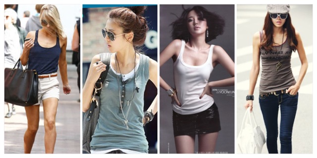1. 把背心紮進近年一直保持流行的中高腰褲, 搭上一條腰帶突顯腰線, 以拉長身材比例~ 2. 貼身的淺色背心外面搭件較寬鬆的暗色背心, 這種兩件式的搭法, 可以增加層次感~ 3. 簡單的白色背心, 配上貼身黑色牛仔短裙, 表現出低調卻又有點狂野的衝突感~ 4. 不論上身選擇何種顏色的背心, 百搭的暗色牛仔褲絕對都能夠適當的消化~
