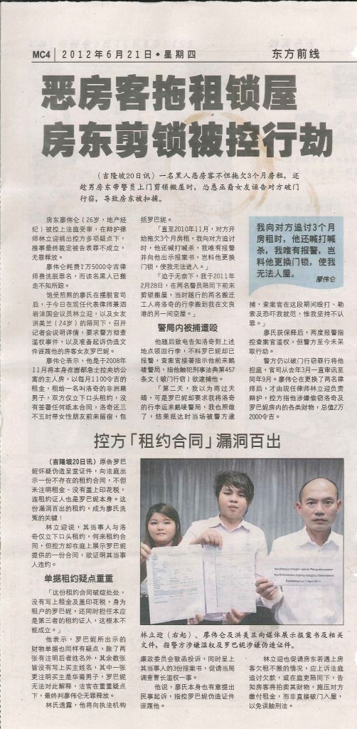 我问了人家,要申请法庭聆也要1个月,等他们封物还要很多手续,至少要等超过4个月,我现在已经有新的租客了,哪有人要等怎么久?头痛~ |