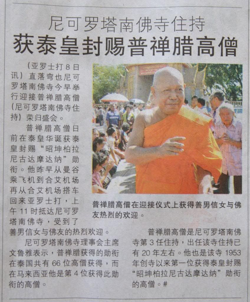 尼可罗塔南佛寺(Wat Nikrodharam)住持普禅腊获泰皇封赐“昭坤柏拉尼古达摩塔纳”勋衔。