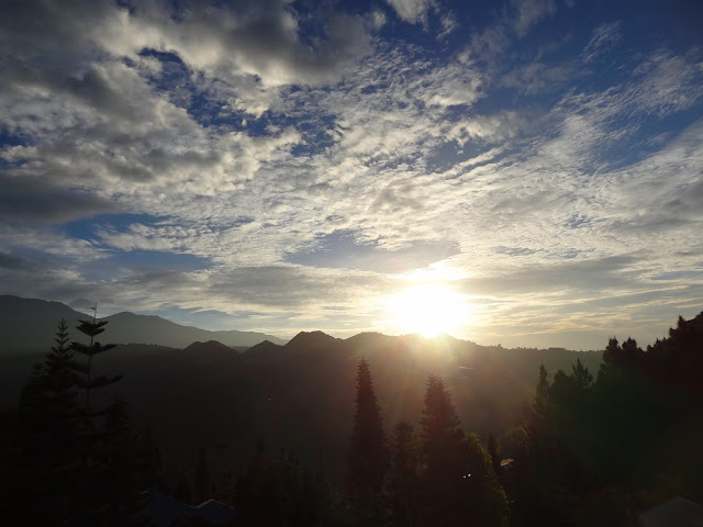 大约六点钟,太阳就开始缓缓升起。今天天气好,加上云不多,可以清楚看见太阳的光束从山脉间冒出来。这是阿七第一次看日出,很感动啊!!看着眼前这土地慢慢从黑暗渐变成光明一片,搭配着鸡啼声,那感觉真好!!