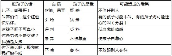 亲友逗孩子是家长们常常遇到的事情,亲友们往往是出于喜爱孩子才逗孩子,但逗孩子对孩子的成长有负面影响,有的家长意识到这一点,有的家长可能暂时未意识到。那么,逗孩子会对孩子造成什么样的影响?在遭遇这样的尴尬事的时候家长如何应对呢? 经常看到大人逗孩子,那种“逗”实际是一种戏弄。他们把孩子逗得出错,或者惊慌、害怕甚至哭泣,大人们便笑了。逗孩子的那些成人并没有恶意,甚至还是出于对孩子的喜爱,但对孩子来说这真是一种残忍的行为,因为孩子不懂大人们的玩笑,他们会当真,成人的“逗”往往会让他们感到愤怒、惊恐、不安、被欺骗、不被尊重,让他们的心灵受到伤害。 一次在餐馆吃饭,我看到一群大人逗孩子,那一幕看得我难受极了。 首先是孩子的爸爸指着他的朋友(大约30多岁)笑着对孩子说:儿子,叫哥哥! 爸爸的朋友则笑着对孩子说:不能叫哥哥,叫伯伯! 孩子爸爸继续逗孩子:叫哥哥! 在这一声声“叫哥哥”、“叫伯伯”中,孩子茫然不知所措。 爸爸的朋友掏出一个红包在孩子眼前晃了晃说:叫声伯伯,这个红包便给你。 孩子不知道到底该叫眼前这个男人“伯伯”还是“哥哥”,犹疑着不吭声,也不伸手接红包。 爸爸的朋友作势要把红包收起来:不叫伯伯啊,那这个红包不给你了。 孩子不吭声。 旁边一位阿姨笑着说:这孩子胆子可真小,一直不说话,哈哈。 我在旁边看着,为这个孩子感到难过。由于大人们之间的玩笑,他不确定到底该叫那位男士“伯伯”还是“哥哥”,由于怕叫错,索性他不开口叫人,却被贴上了“胆小”的标签!孩子此刻一定觉得自己不够好,胆子不够大,这是多么糟糕的事! 男士们喝酒去了。过了一会,一位女士接过了接力棒。 她走到男孩身边,蹲下来问道:xx,你是男孩还是女孩?我猜你是女孩。 本来情绪缓和了一点的孩子不高兴了,沉默。孩子明明是男孩,这位女士却故意说他是女孩,孩子感受到了女士提问的虚假,所以他不回答。 女士继续逗,你不说啊,那你就是女孩啦! 孩子有点着急,趴到妈妈腿上,仍然不说话。显然他心里既着急又愤怒,愤怒的是明明自己不是女孩,那个阿姨却乱说自己是女孩;着急的是,他不知道如何辩解。对于孩子而言,每一位大人都是一个巨人,孩子要反抗陌生的“巨人”需要一定的勇气,尤其对于那些内心力量弱小的孩子而言,他们往往没有勇气去反抗、拒绝和辩解,他们只能默默忍受“巨人”对他们的捉弄,内心却感到无比害怕和愤怒。 这时,孩子的爸爸笑着说,再这样下去他一会儿会哭的。孩子的妈妈只是笑着,并不阻止那位女士逗孩子的行为。 女士并没放过孩子,对孩子说,来,阿姨抱抱你,行不行? 孩子缩到妈妈怀里,不说话。前面的捉弄让孩子对女士毫无好感,怎么可能让她抱呢? 女士笑着说,你不说话啊,那我就强行抱你啦!边说边伸手假装要抱孩子。 孩子终于“哇”的一声,吓哭了,一桌子大人全笑了… 以这个案例为例,我用图表的形式来分析“逗”孩子的实质、孩子的感受及可能造成的后果: 我难受的不是别人怎样逗孩子,周周从小到大遇到过多次这样的经历,我难受的是孩子的父母全然未能意识到孩子的内心变化,未能给孩子提供保护和支持。这个过程中大人们是得到了快乐,但这种快乐建立在孩子的痛苦的基础上。孩子得到了什么呢?他被大人们欺骗、引诱、愚弄和吓唬,他小小的心感到疑惑、受挫、不被尊重和害怕,这让他感到不安,自尊心、自信心受到伤害,不敢相信别人,对他今后的人际交往可能造成障碍。