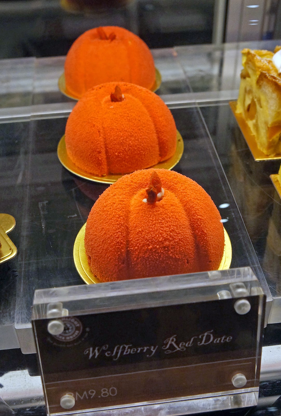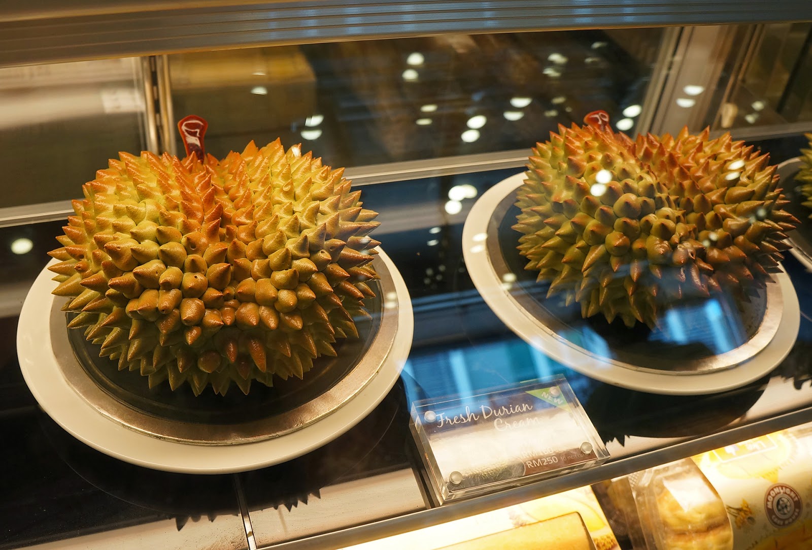 这就是让我印象最深刻的Fresh Durian Cream Cake了,站在玻璃柜前看了非常久,因为这实在做得太像真的榴莲了!这烘培师不止有技术,还有胆识。不过这榴莲蛋糕只有买整粒的,而且价格不菲(RM80,RM160,RM250),所以我虽然非常好奇,却也没有买来尝试。有人吃过吗?值不值得这个价格呢?