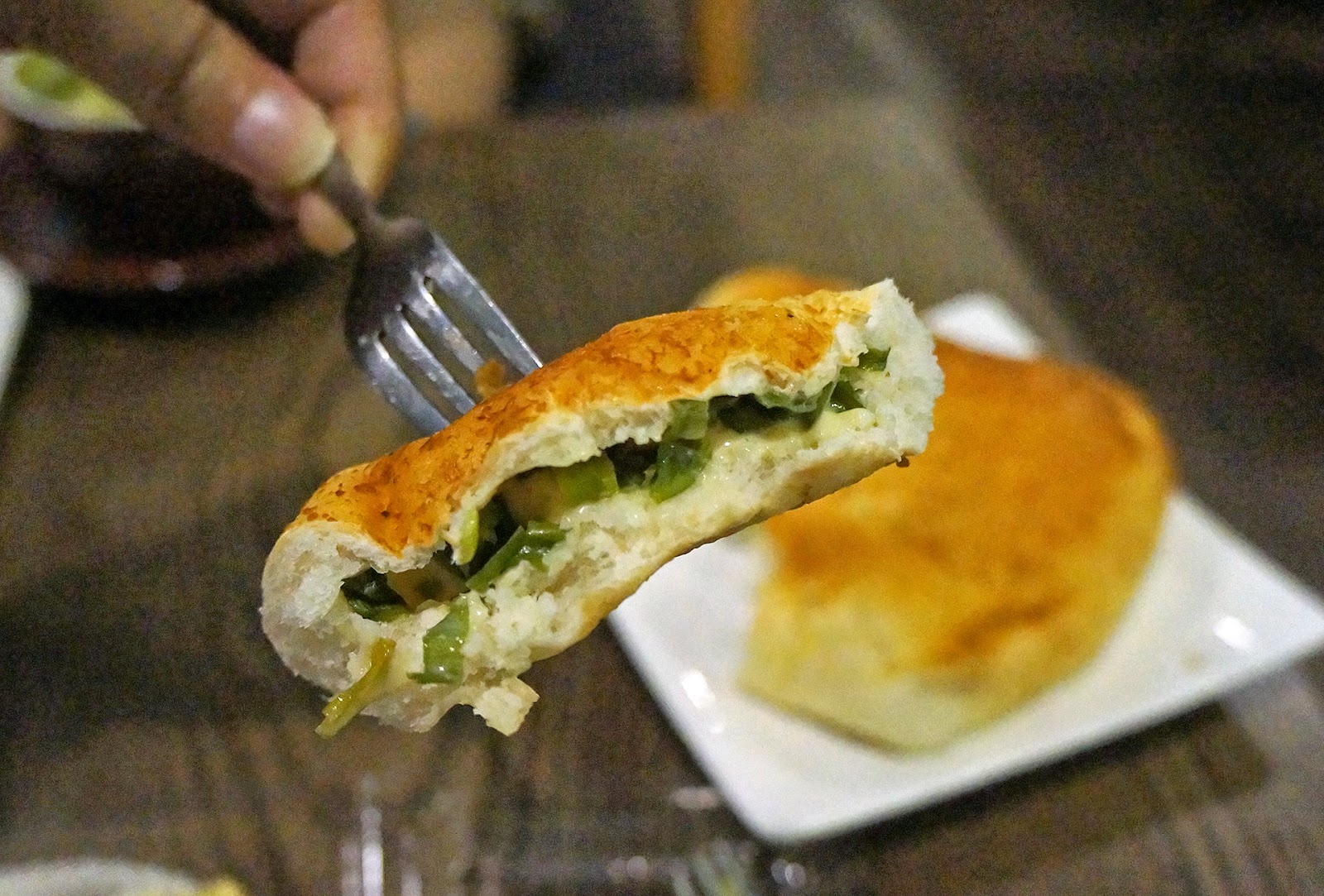 面包口感不错,里面的葱蒜带来的味道是特别,有点像猪肉包(虽然没肉)。