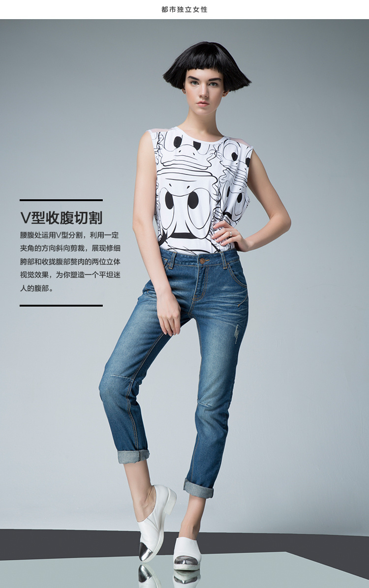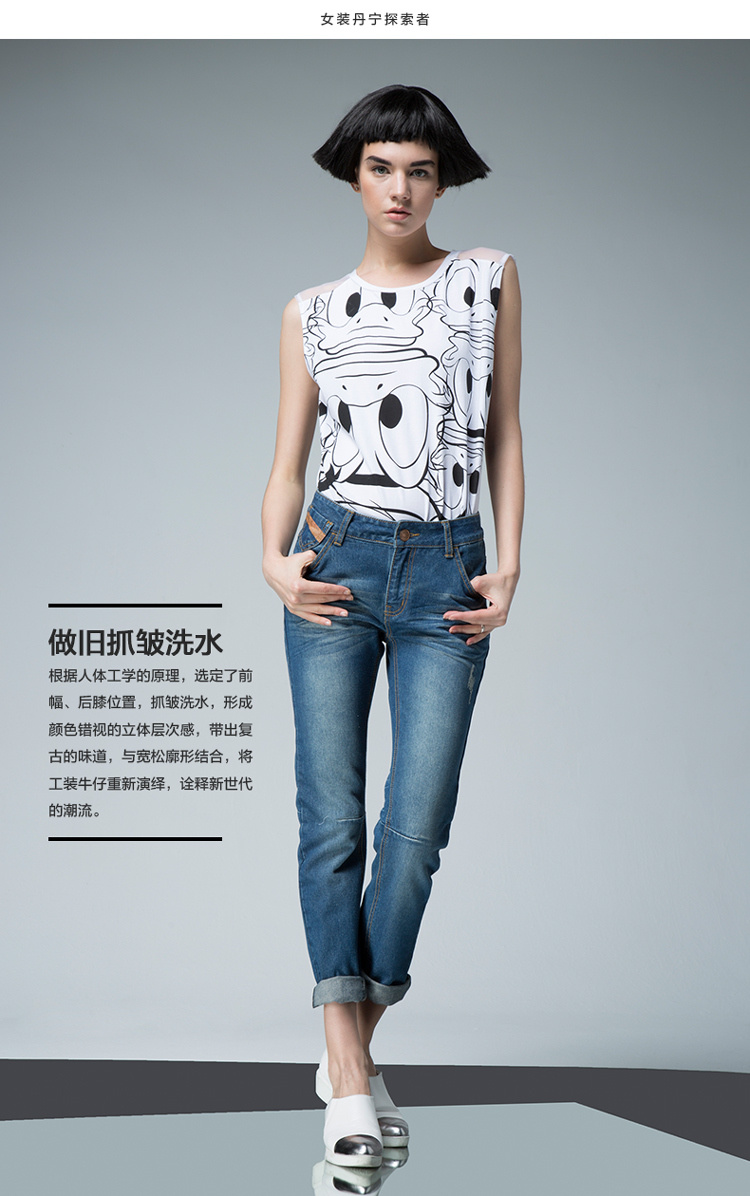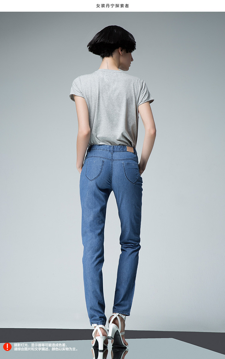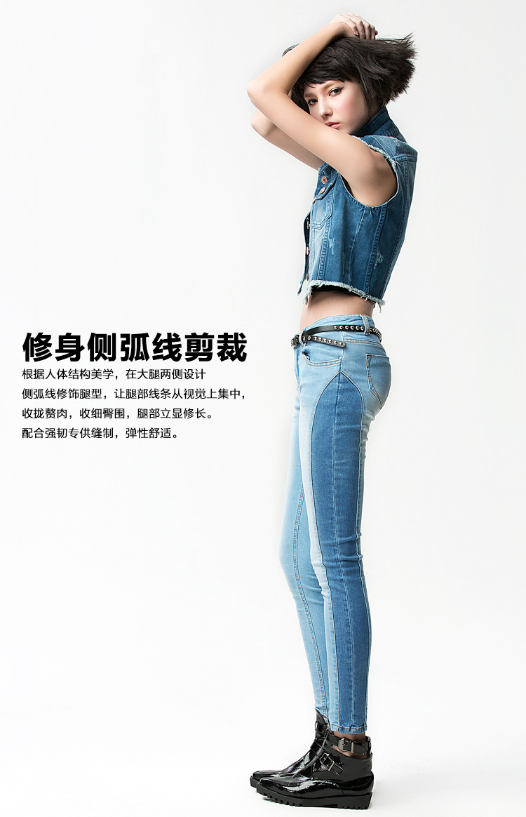 UDOT右道秋季新款牛仔裤女中腰紧身磨白做旧九分铅笔裤拼接