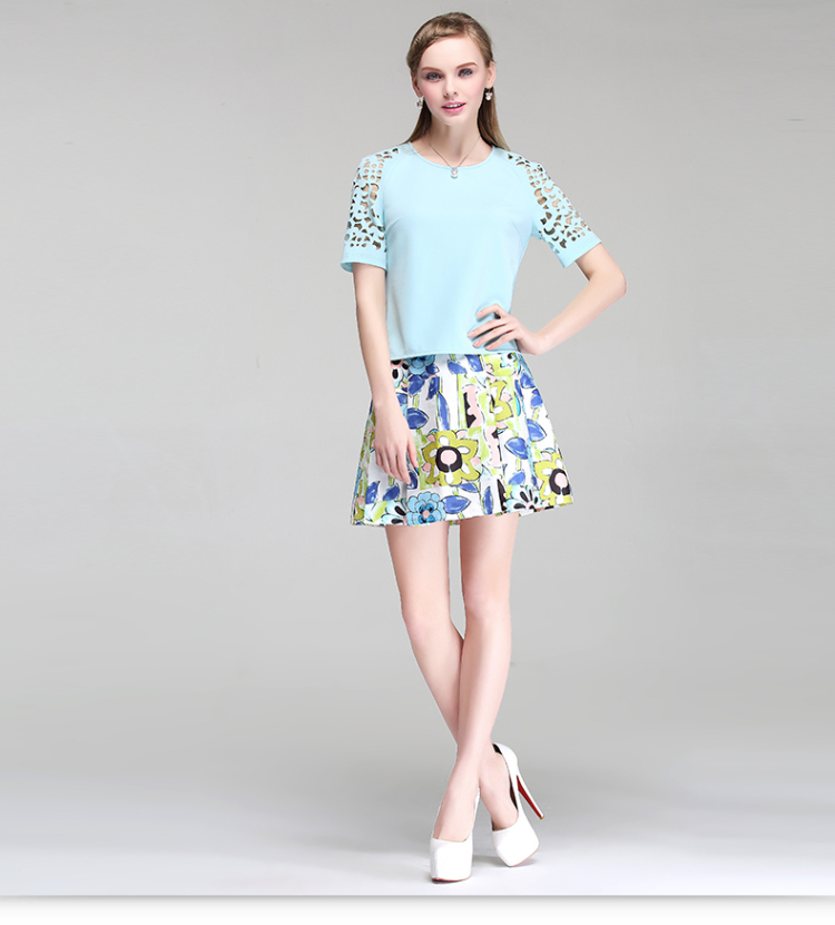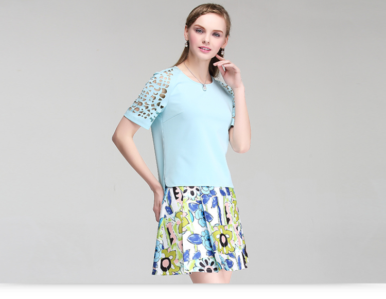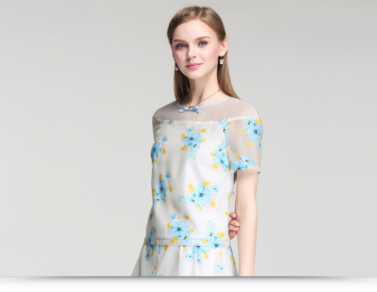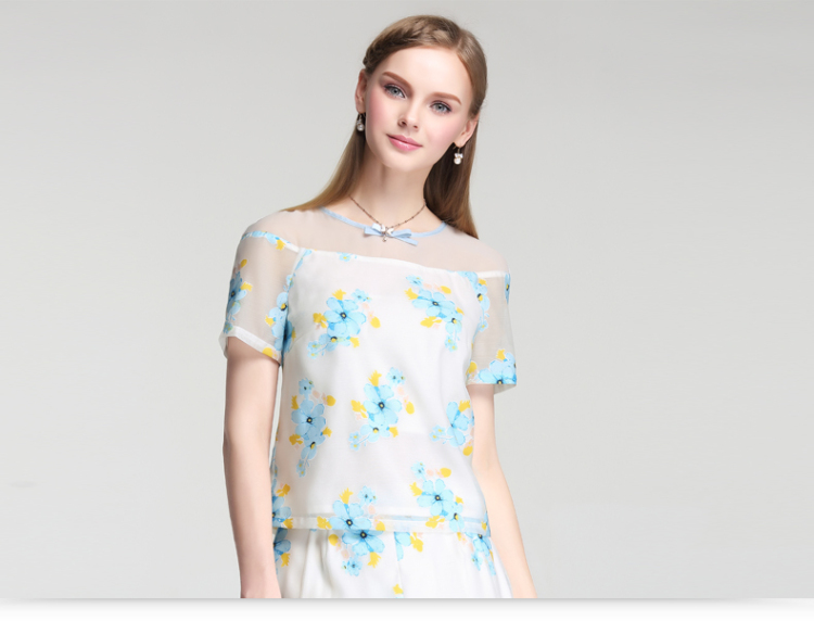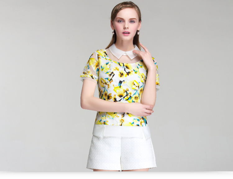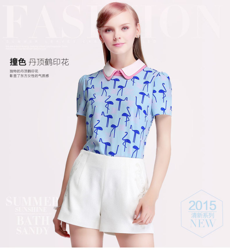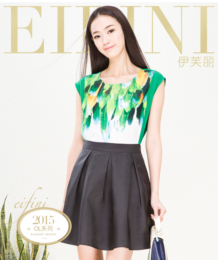 EIFINI伊芙丽2015夏装新款韩版印花撞色显瘦短袖圆领女雪纺衫