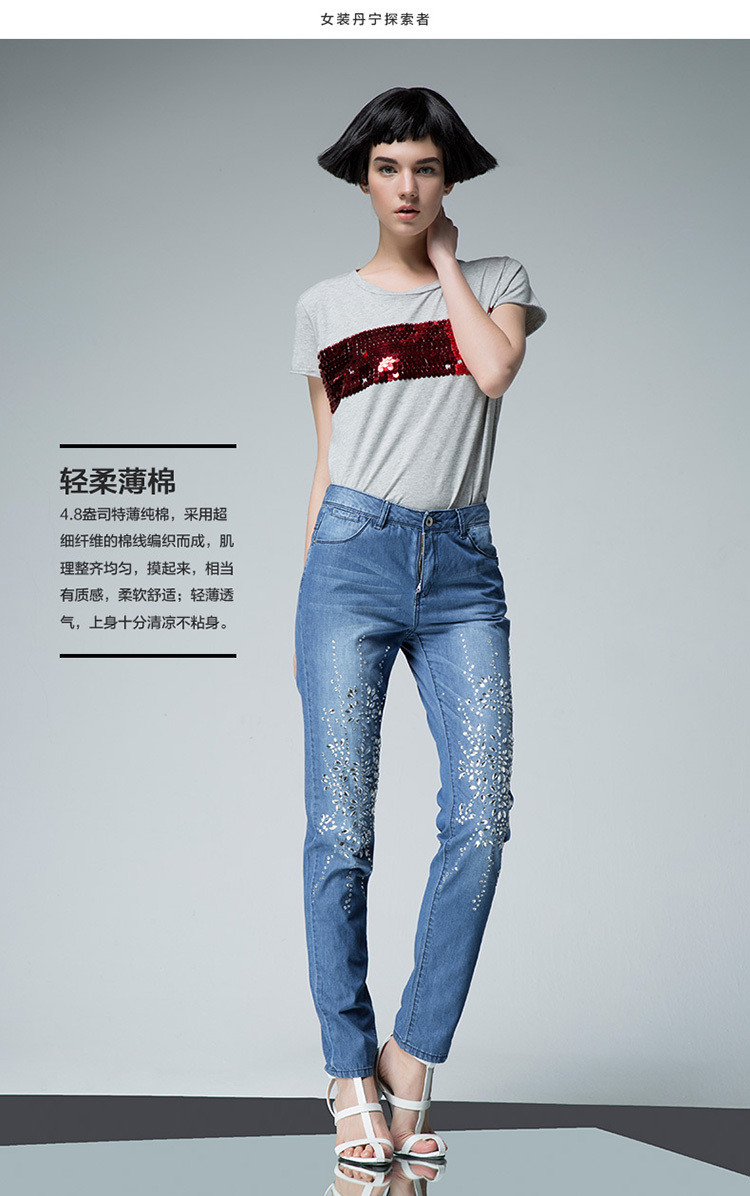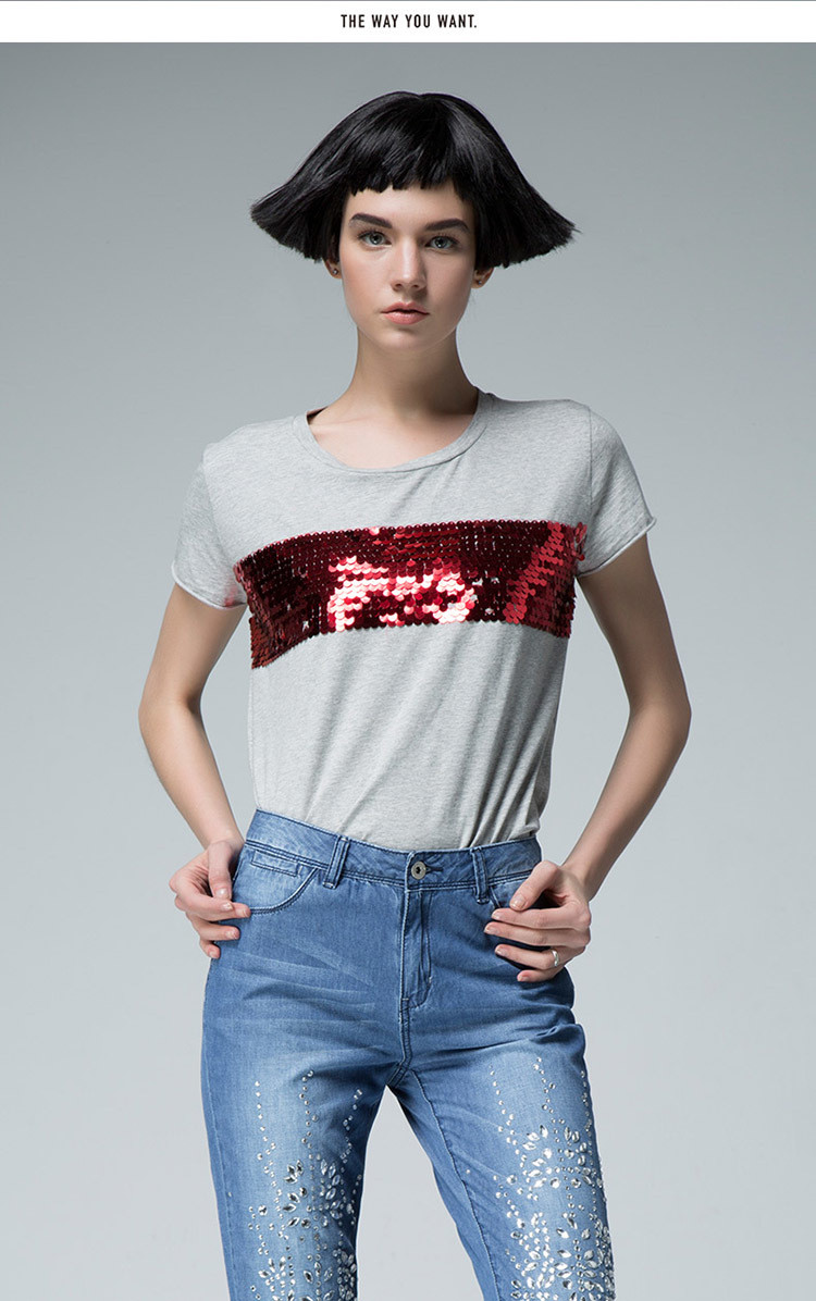 UDOT新品右道欧美无边珠片修身显瘦圆领短袖T恤女夏2015夏季新款