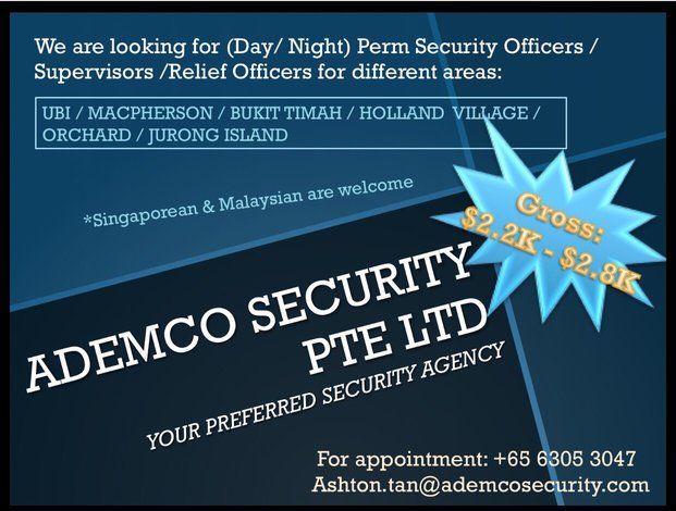 Always wanted to work in Singapore? With the uprising of SGD (Current rate about SGD 1 = RM 2.80), more and more Malaysians are crossing the border to earn fast cash. Now it's your chance! We are looking for security officers / supervisors / relief officers for different areas in Singapore (Ubi / Macpherson / Bukit Timah / Holland Village / Orchard / Jurong Island), there is gonna be a location that is convenient for you!