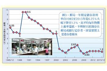 理由3:因应低利率 最后,再从近三十年利率的走势来看,如图三邮局一年期定期储蓄存款利率自一九八五年至二○一五年,从六.二五%大幅下降至一.二%,二○○○年以前利率平均还有六.六三%,二○○一年后的平均只剩一.五%,比平均每年的物价上涨率还低,代表不理财只把钱存在邮局或银行定存的人,财富实质上是愈存愈缩水的。 从另一个角度来看,若每月存一万元做为退休准备,在利率是六.六三%时,三十年后约可存到一一三五万退休金,假设退休后余命二十年,同样将这笔退休金放在六.六三%的存款帐户内,每个月约可用八万五千元,至寿终那天刚好把钱用完,称得上是极为不错的退休生活。 但若利率是一.五%,则三十年后退休金只存了约四五四万,同样假设余命二十年,将这笔退休金仍存在一.五%定存帐户内,按月拿出来用,则每月只能用约两万元左右,仅主计处公布民国一○三年经济户长六十五岁以上家庭平均消费支出约四万元的一半,可知身处低利年代,不理财只用存款寄托财富,将使自己沦为财富重分配下贫者愈贫、生活较困窘那一群;故一定要理财的第三个重大理由是:透过理财因应低利率。 除了上述三大理由,理财还有协助达成人生各项目标、过更好的生活、有能力回馈社会等好处;所以,一定要理财喔!