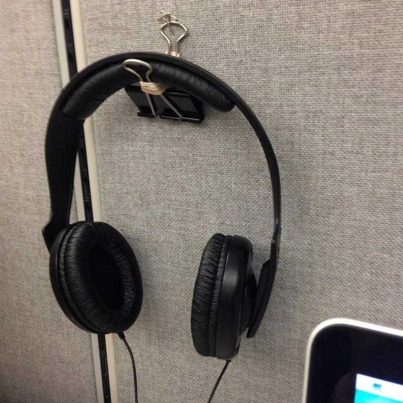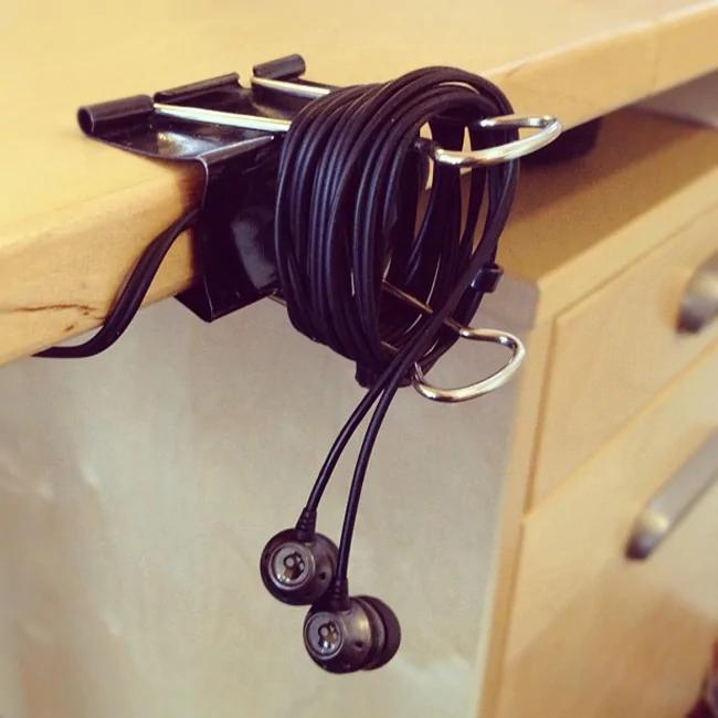 柜子满满的,完全没地方放耳机吗?嫌耳机线总是乱糟糟地绕成一团,用的时候还得先耐心慢慢解开理顺实在太麻烦吗?装订夹同样能够帮你解决这个问题,像上图一样找个地方固定好装订夹就可以充当耳机架啦,虽然不怎么好看,但胜在实用而且低成本嘛。