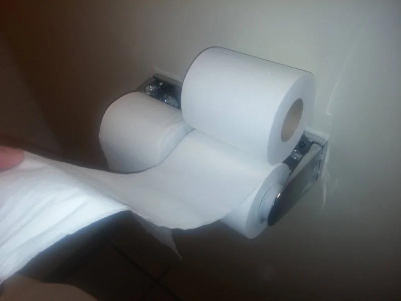 去洗手间最尴尬的事之一就是自己没带纸巾,然后洗手间里供应的竟然用完了,所以有网友分享了一个比较人道的应对做法,那就是在厕纸筒上再放置一卷厕纸,不过有两点要注意哦,一是最好是放在全封闭式能开合的那种厕纸筒上,不然像图片中这种,上面那卷备用的厕纸很容易掉下来,第二就是最好备用厕纸不拆外包装,否则长时间放着很不卫生。