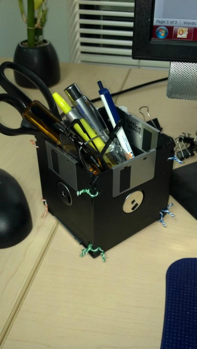 这种磁盘现在估计也就只剩下收藏纪念的价值了,如果你手边有很多,把它加工一下变成笔筒或者置物盒吧,总好过放在那里铺尘吧?