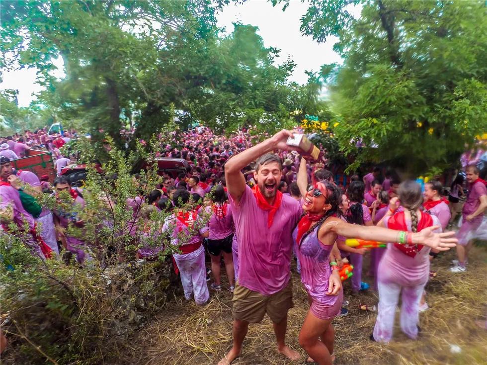这对夫妇名为布雷特-斯威顿(Brett Sweden)、比安卡-布朗斯奇威勒(Bianca Brunschwiler)。4年前,他们在西班牙旅行,参加了巴斯克自治区一年一度的葡萄酒之战——香格里拉巴塔拉维诺。每年6月29日,成千上万的西班牙人和来自世界各地的游客都会聚集在这里。市政府会给参加活动的人提供几千升酒,但其中很多人也会自带葡萄酒。参与者穿着白色的T恤,拿着各式各样的容器,互相泼洒红酒,直到从头到脚都变成紫色。一次葡萄酒大战通常会消耗5万升红酒。图为夫妻二人在西班牙巴斯克自治区。