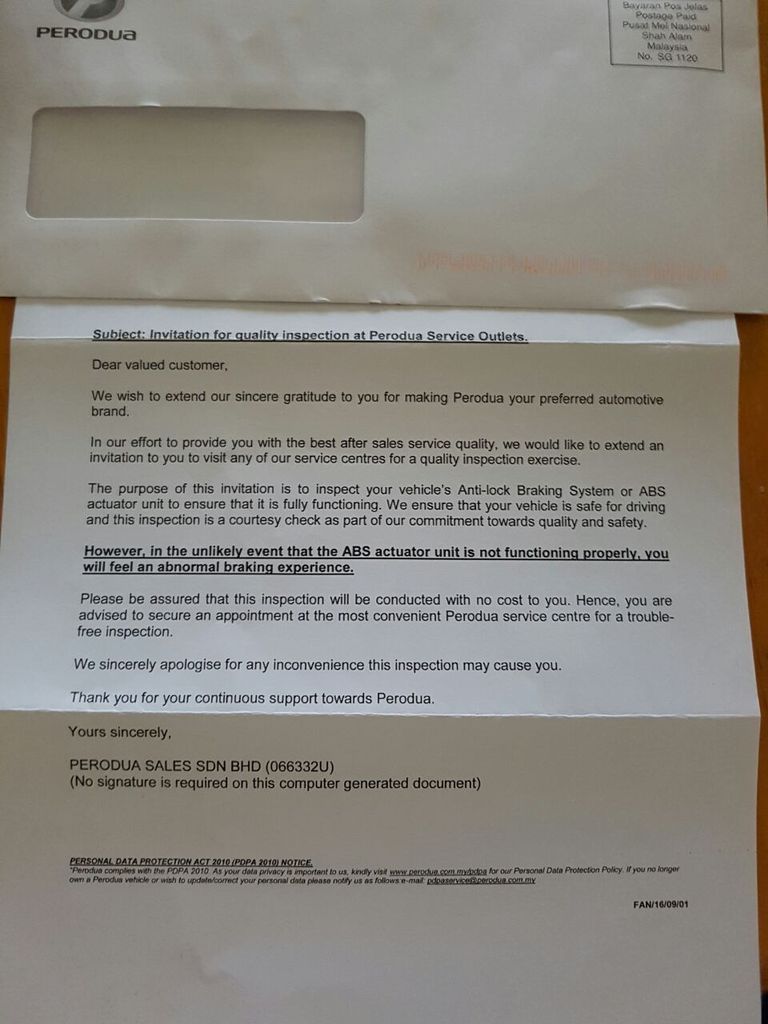 谁有收到perodua 的信? 说叫车主回去检查Abs |