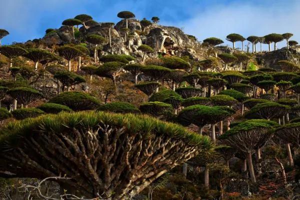 这片森林位于印度洋上的索科特拉岛,该岛上有700多个物种在全世界仅此一处,别无他寻。虽然龙血树在世界其他地方也有,但数量和规模都远不如索科特拉岛。更关键的是形态,此地的龙血树似乎完全不按照基因图谱来生长,就这么傲娇地把自己变成了一把把扫帚。