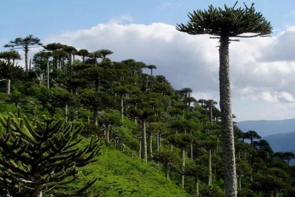 这片森林是活化石,因为猴见愁树,学名其实是智利南洋杉,其树龄可达1300年以上,演化历史相当漫长,既是智利的国树,也被IUCN(世界自然保护联盟)列为珍稀树种。它看上去就像是外星飞碟、菠萝和棕榈树的混合体,堪称自然界的未来主义风格。至于猴见愁的诨号,则是因为尖刺状的叶子密实包裹着果实,即使最灵巧的猴子也只能望洋兴叹。