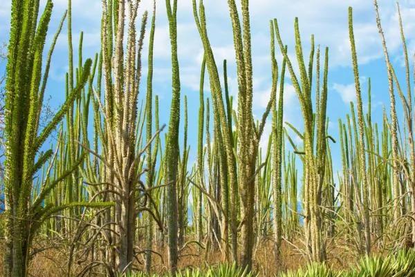 除了千年的猴面包树,多刺森林是世界第四大岛马达加斯加的另一个珍奇特产。森林位于马岛南部,此地终年干旱炎热,年平均降水量不到500毫米,如此极端的气候和地理条件孕育了多刺森林,约3-6米高,看上去纤细飘摇,实则长满尖刺,很不好惹,像是外星生物。而这片让人感觉不友善的森林,却是脆弱的狐猴最可靠的家
