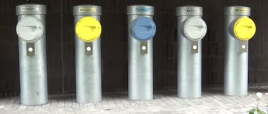 这些看似邮桶的装置,便是垃圾的入口。居民刷卡支付后,便能打开箱门,将垃圾放入其中。桶内设有自动感应装置。一旦装满,阀门自动开启,垃圾们应声而下,在强劲风力的推动下,顺着管道,以每小时70公里的速度,奔向中央收集站的大箱子里。