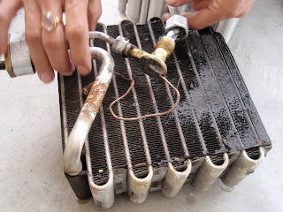 radiator (水箱)前面那片是condensor ,作用是把经过压缩的高热gas 散热,就会顺利变成液态气体,进到车内的cooilng coil (热转换器)经过valve “喷”那个液体气体,cooling coil 就会变冷,有一粒motor 打空气经过冷的cooling coil ,出来的就是冷风了