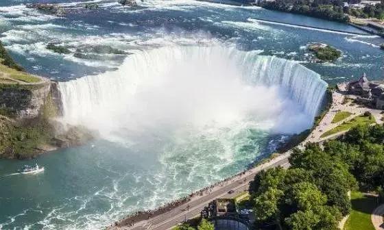 美加边境的尼亚加拉大瀑布共有三个瀑布群,其中位于加拿大的马蹄瀑布是最大的,其次是美国瀑布和新娘面纱瀑布。
