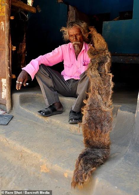 ▼今年已经63岁的 Sakal Dev Tuddu,将一头长发像头巾一样的绑在头上。根据他的说法,在40年前的某个晚上,他的头发在睡梦中突然变成了面条般的“雷鬼头”(Dreadlock),而且梦里上帝还拜访了他,对他表示从此都不要再剪头发,于是他就一直遵守着这条指示了。