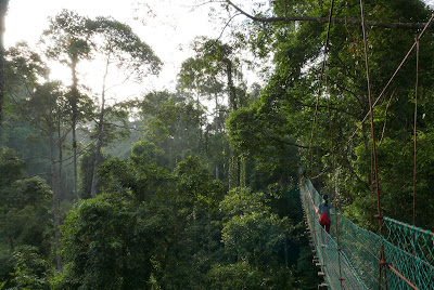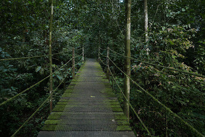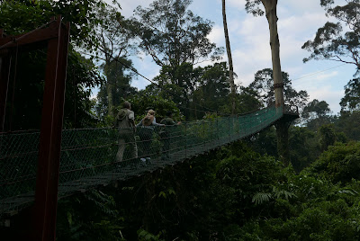 最后,我们来到了吊桥的地方。很幸运地红毛猩猩在吊桥的附近出没。由于红毛猩猩住在树上,就算出现了我们也很难去看到他。上了吊桥后,发觉还有一个西方家庭也是在追寻红毛猩猩的踪迹。最后我们发觉红毛猩猩荡去了比较远的树。由于角度和光线的问题,它刚刚好在一棵没有遮住的树干上吃东西。他是一只成年的雄猩猩。雄猩猩是非常危险的动物。进入了它的地盘会有被攻击的可能。它们的力气比成年人还要大,我们绝对打不过它们。由于我的相机不是大炮相机,所以没能拍到什么东东。