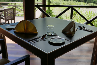 下车的时候,度假村的经理就已经在等候并迎接我们的到来。我们上了2楼的度假村大厅里。大厅很大,是开放式的大厅。同样在大厅里的是酒吧,后面是餐厅。而餐厅面对着的是一座阳台。阳台面对这的是一条小溪、翠绿色的热带雨林和小山。这个景色真的是绝了!雨林的美,真的时经典的仙境。