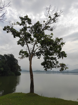 打探了周围一眼,算不上非常惊艳的地方。换来的是非常宁静和让人放松的美。感觉像是在一座很多马来西亚都有的城市公园。放眼看过去,就是接待处兼食堂兼活动空间的马来高脚屋。另外一边是负责人和他的家庭成员真正的家。再后面就是贞德湖Chenderoh Lake,也是全马第一座水坝发电站所引出来巨大的人工湖。这座湖如此之大,吞没一座小镇绰绰有余。人工湖的地形有别于一般天然的湖泊。这些湖往往是淹没了的山谷,所以这些湖的形状都是瘦瘦长长,而且有许多无人小岛在湖中央。