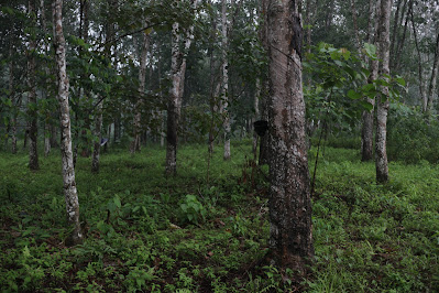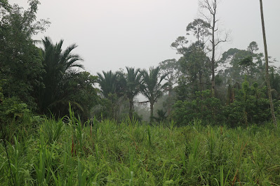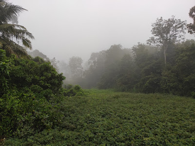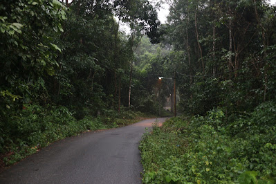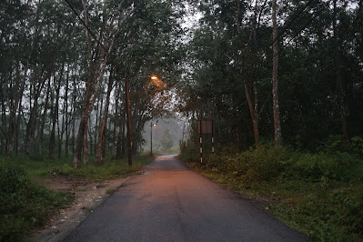 过了大路的另一边是更偏僻的野外。我们都只是踏步在毛毛雨中走。这里大多数都是开发过的树林和草地。除了有些时候有摩多经过,再也没有其他人在这里了。一路上我们还看见了一些没怎么照顾好的橡胶园和棕油园。规模小小的,应该是本地村民自己拥有的。在路程中,天色已经渐渐黑暗起来了。下过雨的空气格外清新,加上已经到了黄昏的时间,整个人走了那么远感觉还是感觉到凉快。路灯也开始凉了起来。无人的野外小道上的风景,感觉身在龙猫世界丽的乡下情景。然而时间不等人。天真的暗下来,我们就只能在微光下行走。有点危险。