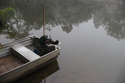 此刻,湖面上的迷雾已经散开了。露出了绿油油的沼泽树林和蓝天白云。过后我们就离开这里了。